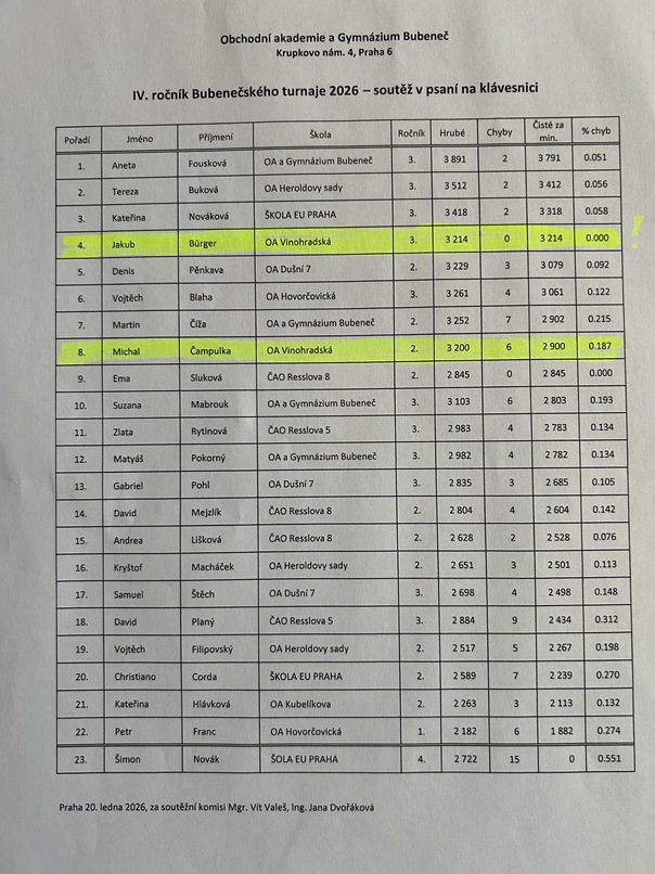 Na Obchodní akademii a Gymnáziu Bubeneč proběhl v úterý 20. ledna 2026 Bubenečský turnaj. Byl to již IV. ročník soutěže v psaní na klávesnici. Soutěže se zúčastnili i naši dva studenti:
